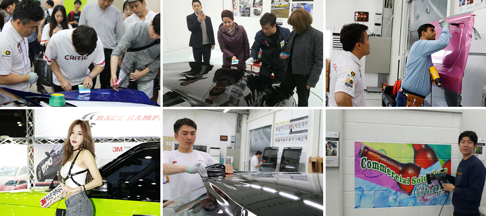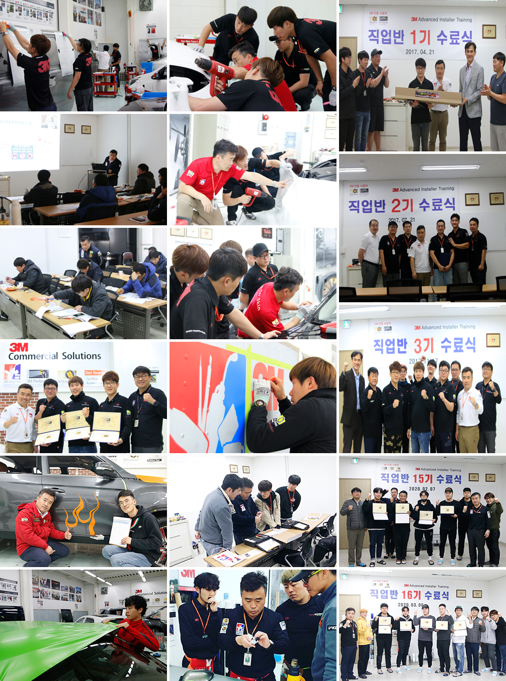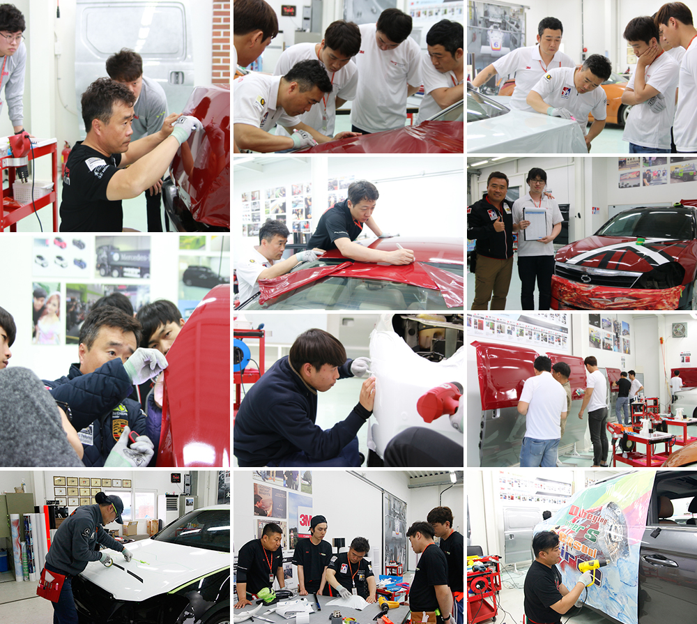 4일간 오전 3h (총 12시간) 필름의 기본 구조, 제품별 등급 및 회사별 사용 용도, 그래픽 실사 및 커팅과 가공 과정 소개 시공(부위 및 차종별) 및 교육(기술별) 동영상 활용 |