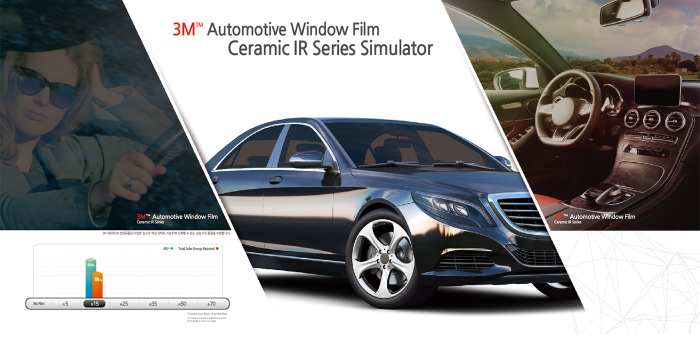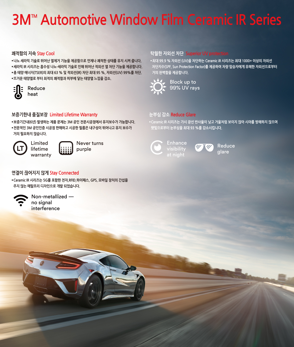 모든 차량과 잘 어울리는 칼라와 스타일, 태양에서 방출되는 열(IR)과 인체에 유해한 자외선(UV)를 최소화시키고, 에너지 절감효과까지 누릴 수 있는3M의 혁신적인 제품을 시공 받으실 수 있습니다.