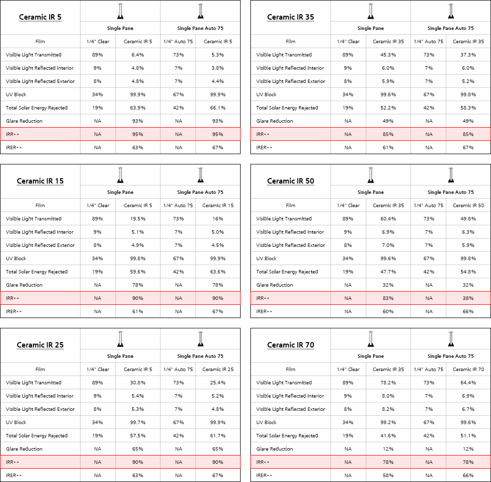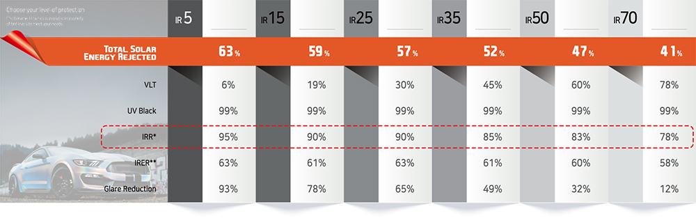 Ceramic IR Series는 나노 세라믹 기술로 최고 등급의 열(적외선 IR)및 자외선(UV) 차단 기능 제공으로 자외선은 최대 99% 차단, 총 태양 에너지의 최대 63 %, 열(적외선 IR)은 최대 95%를 차단하여 차량실내를 항상 쾌적한 환경으로 유지시켜줍니다.