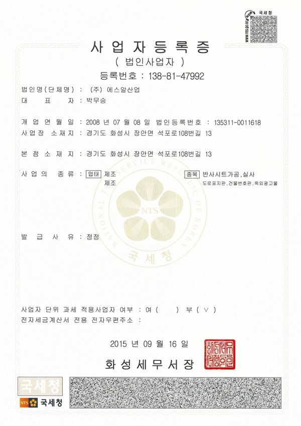 사업자등록증 - 에스알산업
