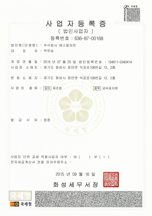 사업자등록증 - 에스알아트