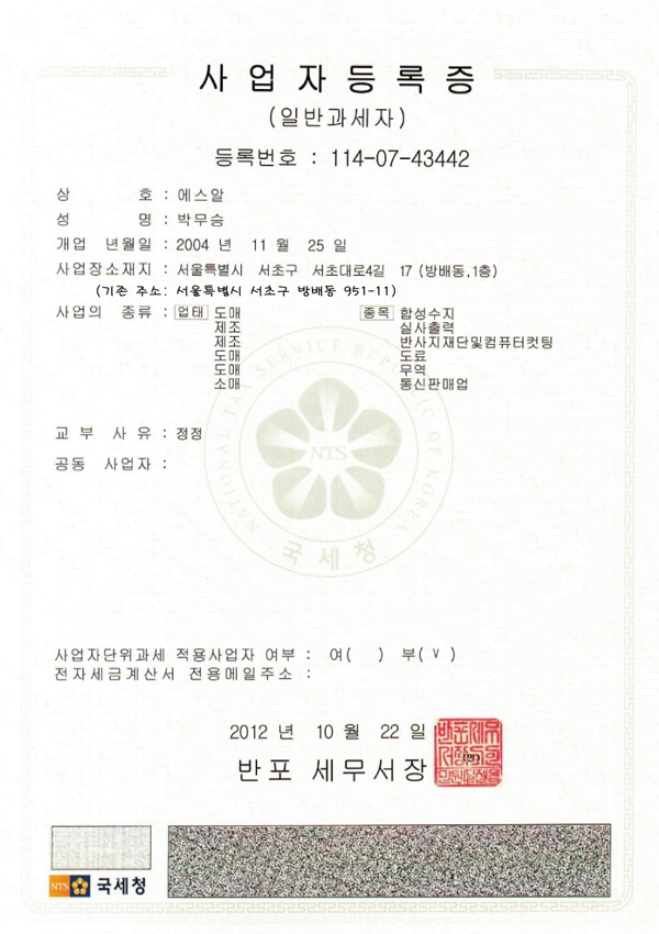 사업자등록증 - 에스알