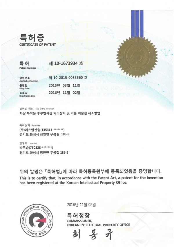 특허출원증(차량부착용 후부반사판 제조장치 및 이를 이용한 제조방법)